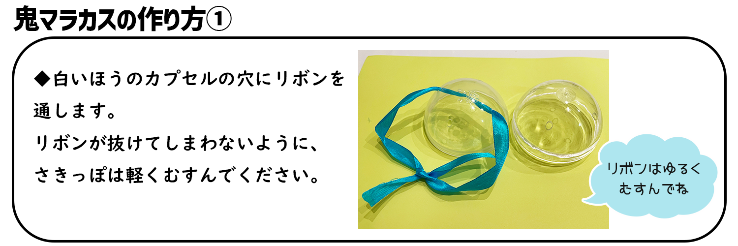①カプセルをあけて、中の穴にリボンを通して先を軽く結ぼう。