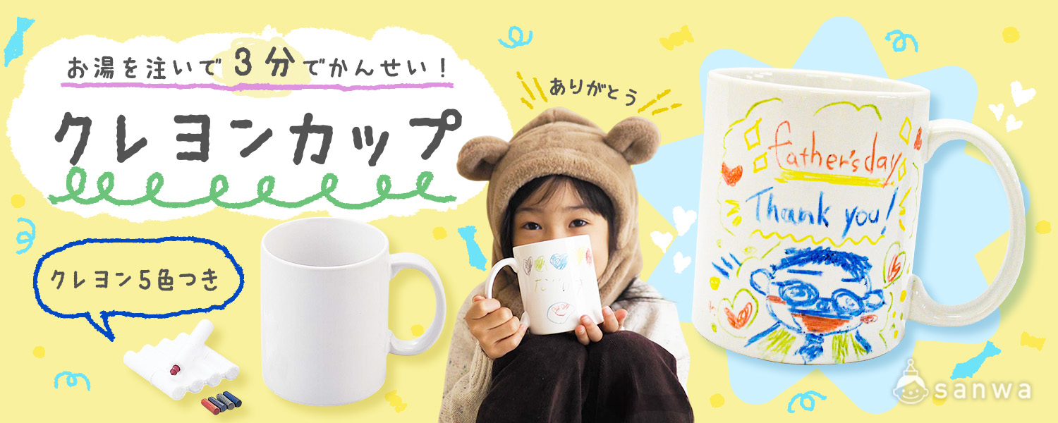 『クレヨンカップ』は、付属の専用クレヨンでお絵かきして、お湯を注ぐだけで簡単に絵が焼き付けられるマグカップ工作キットです。
