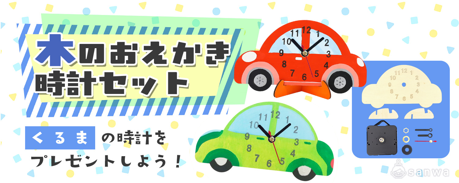 『木のおえかき時計くるま』は、車の形にカットされた木の板に色を塗るだけで、かわいいオリジナル時計が作れる工作キットです。