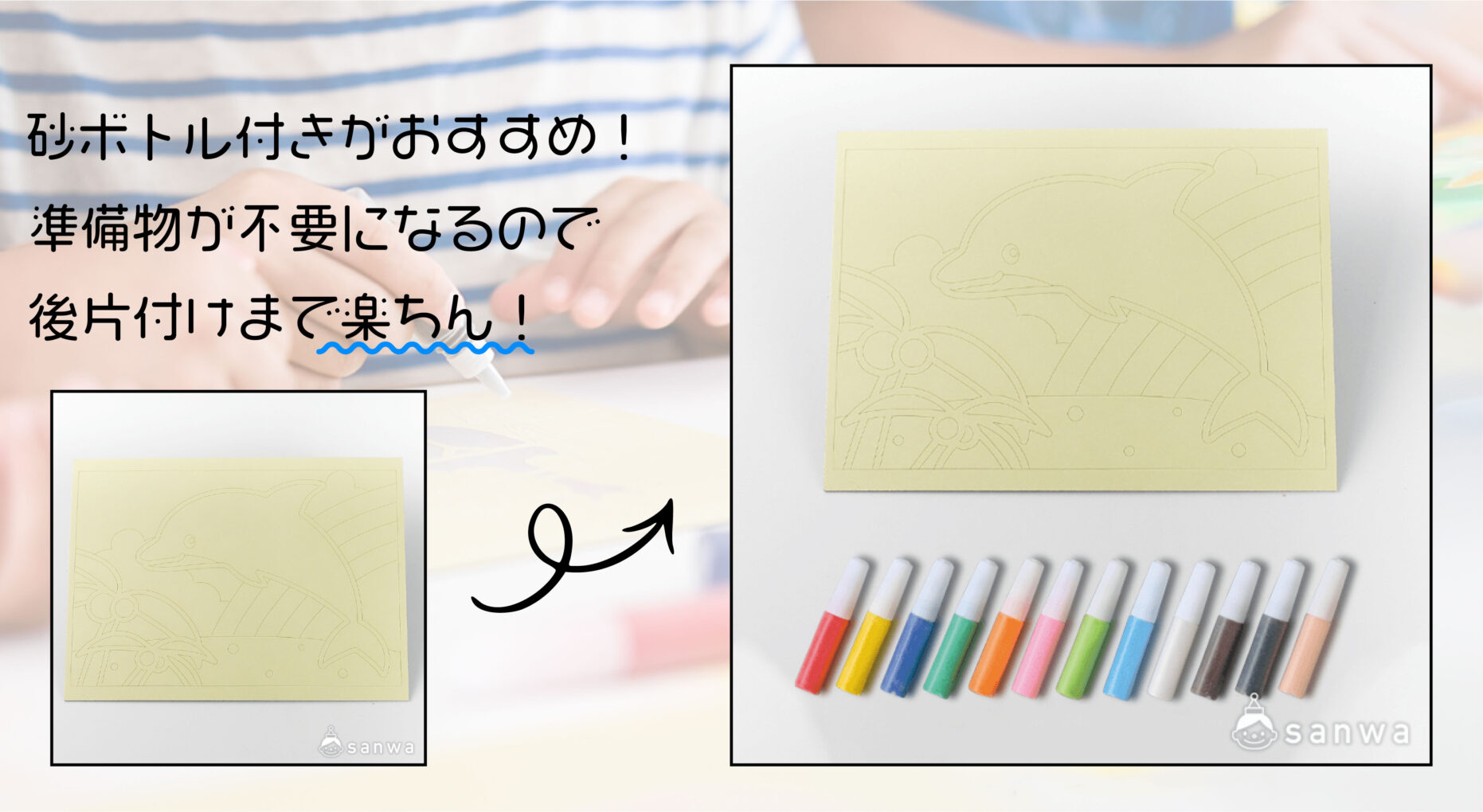 「かんたんすな絵」は、シールをめくって砂をかけるだけで完成する、
