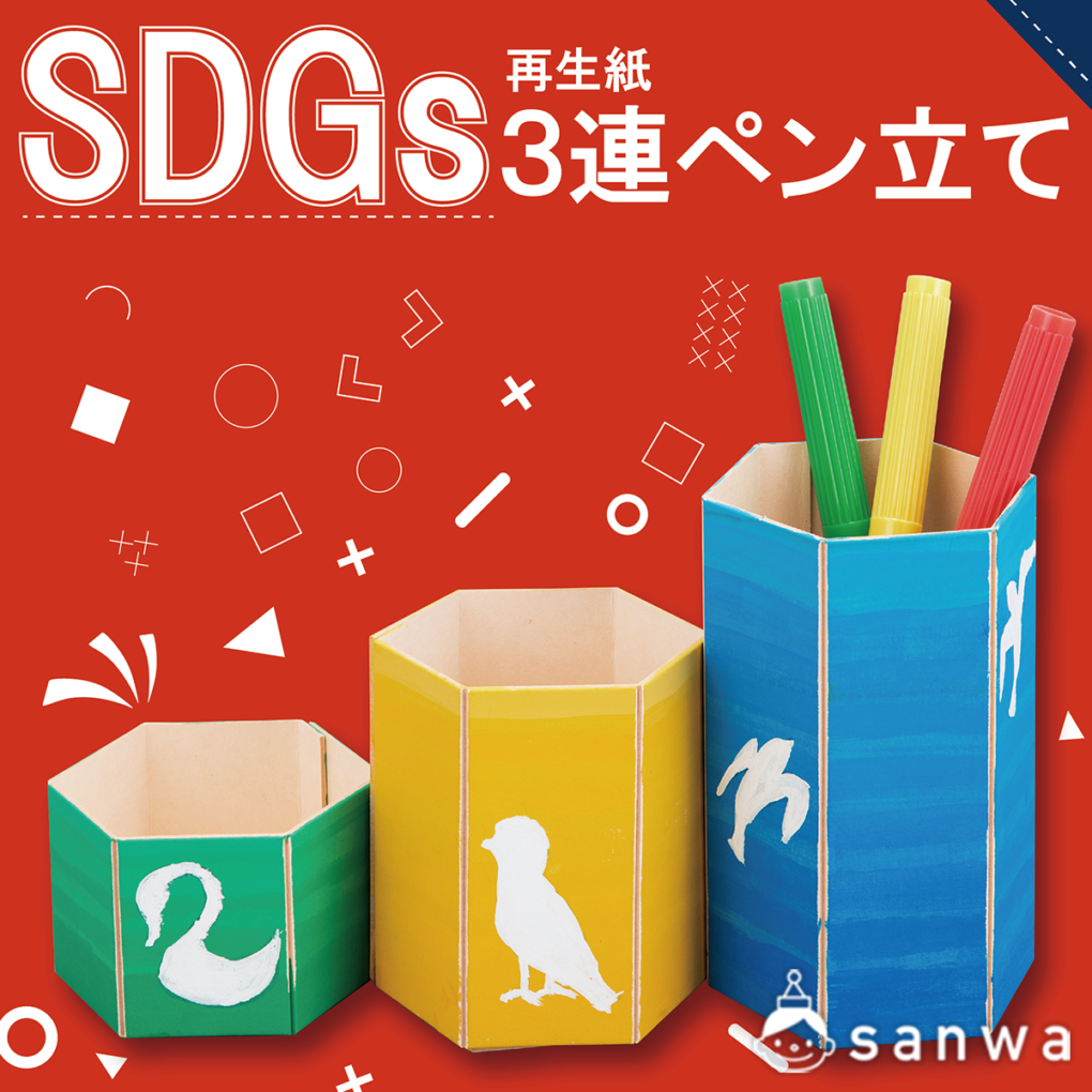 3つの六角筒でペン立てや小物入れに使える作品を作ることができる、牛乳パック100%再生紙を使用したエコな紙工作キットです。
