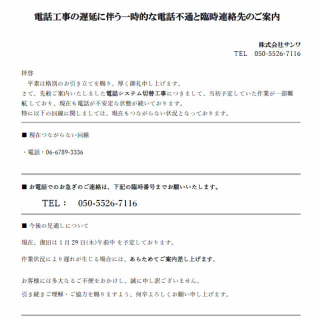 さて、先般ご案内いたしました電話システム切替工事につきまして、